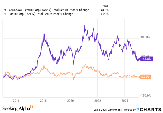 其中,最有经验的是两家日本机械臂制造商 Fanuc 和 Yaskawa,它们在过去十年中并没有带来很好的总体回报: