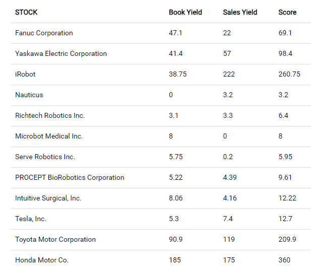 得分越高并不一定意味着买入更好。就此筛选而言,得分较高的是那些有潜力进一步发展机器人技术而非以机器人技术为中心的汽车股。