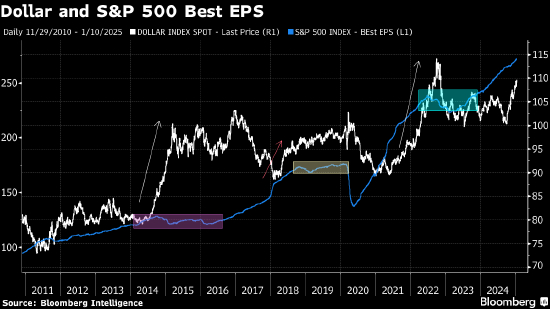 美元近期飙升是另一个悬而未决的问题:虽然这可能降低进口成本,从而抵消关税上调的影响,但也可能减少出口需求和海外利润价值,使跨国公司的前景变得更加黯淡。