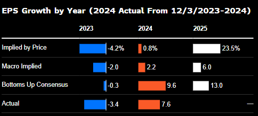 行业研究数据显示,标普500指数消化的未来12个月每股收益增长约为23%,股价中体现的预期值异常之高。自下而上的共识预测认为2025年每股收益增长13%,这意味着这些预测需要增加近一倍,才能证明标普500指数的走势合理性。