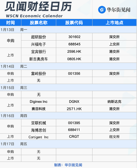 当周(1月13日-1月17日)A股有5只新股申购,1月13日,超研股份、兴福电子开启申购;1月14日,富岭股份开启申购;1月16日,亚联机械、海博思创开启申购。港股市场5只新股上市,分别为宜宾银行、新吉奥房车、赛目科技。