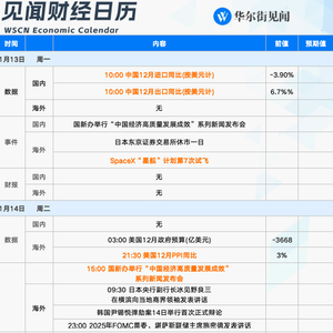 - 13日至15日,央行不定时公布12月社融、新增人民币贷款等金融数据。