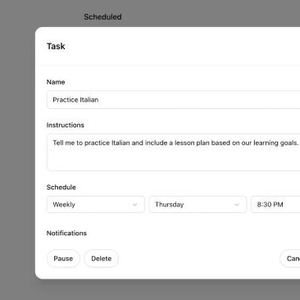 如果想设置一项利用Tasks功能的任务,用户就要在模型选择的下拉菜单中切换到“带计划任务的4o”(4o with scheduled tasks),然后编写任务的提示词。如截图所示,给这个任务命名,下达指示,输入希望ChatGPT做什么,以及希望何时完成,并选择提醒的频率和时间。