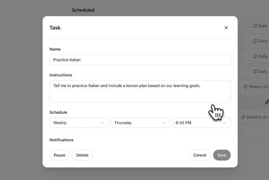 Tasks适用于不同版本的ChatGPT,可以通过台式机、网页和移动设备发送任务通知,但只有网页版ChatGPT有任务管理器。用户可以在对话中直接管理任务,或者通过个人资料惨淡中的新Tasks区管理任务,即修改或取消设置的任何任务。