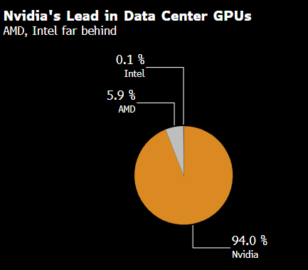 Advanced Micro Devices Inc.可能是最接近于英伟达的竞争对手。但其对2024年AI加速器销售额预期为超过50亿美元,跟英伟达当前财年预计达1140亿美元的数据中心收入相比相形见绌。身处转型困境的英特尔更加落于人后,由于AI加速器的订单弱于预期,公司称销售额达不到2024年5亿美元的目标。