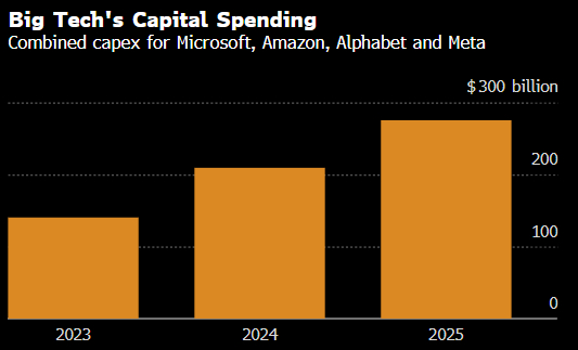 英伟达的上涨最终取决于对AI服务的需求。其近一半的收入来自几家急于增强计算能力的科技巨头。微软、亚马逊、Alphabet Inc.和Meta Platforms Inc.当前财年的资本支出预计总计达2,570亿美元,高于2024年的2,090亿美元。当然,要是AI没有给这些公司及其客户带来所期待的大笔销售,那么这些计划可能就会生变。