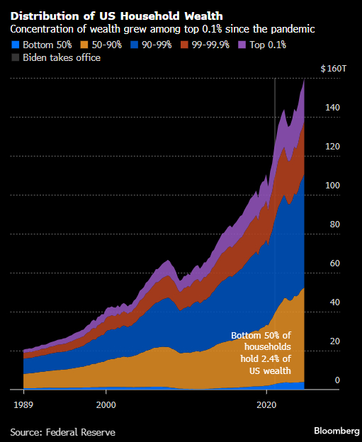 根据彭博亿万富翁指数,过去四年里最富有的100名美国人的财富增加了超过1.5万亿美元,其中埃隆·马斯克, 拉里·埃里森和扎克伯格等科技大亨财富增幅居前。美联储截至9月的估计数据显示,最富有的0.1%人群财富增加了超过6万亿美元。