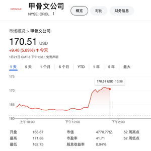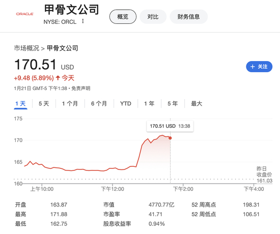 甲骨文、OpenAI和软银尚未立即回应相关评论请求。受此消息推动,甲骨文股价周二盘中一度涨超6.7%,后涨幅收窄至6%以内,报170.51美元。