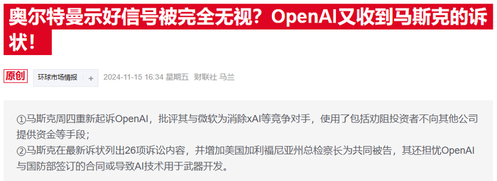 目前,马斯克旗下的xAI正在与OpenAI竞争。有分析认为,由于马斯克在特朗普竞选中发挥的作用,他可能会在新政府中有AI领域的发言权,会让OpenAI处于不利的地位。