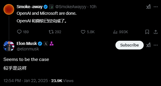 在另一篇推文下中,马斯克还对“OpenAI和微软已经完蛋了”的评论表示赞同,评论称: