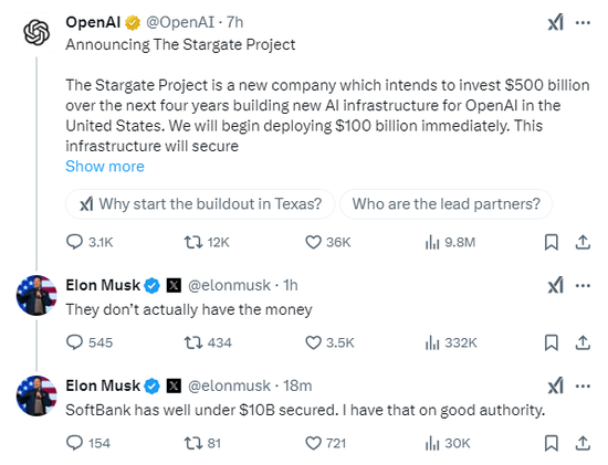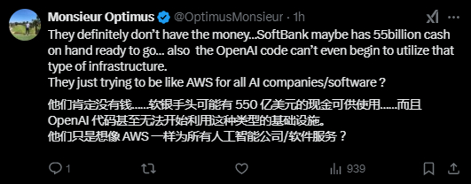 OpenAI宣布开始为“星际之门”项目部署1000亿美元资金,马斯克转发并评论称:“他们实际上没有钱”。