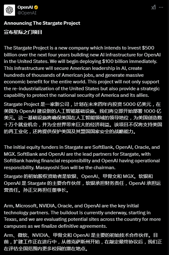 据此前公告,“星际之门”的初始投资额为1000亿美元,预计未来四年内增加至5000亿美元,预计将在美国创造10万个就业岗位。
