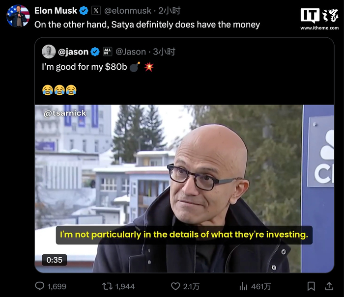 IT之家 1 月 23 日消息,微软 CEO 萨蒂亚・纳德拉对埃隆・马斯克质疑特朗普主导的 5000 亿美元 AI 基础设施项目“星际之门”资金不足的说法不以为意。