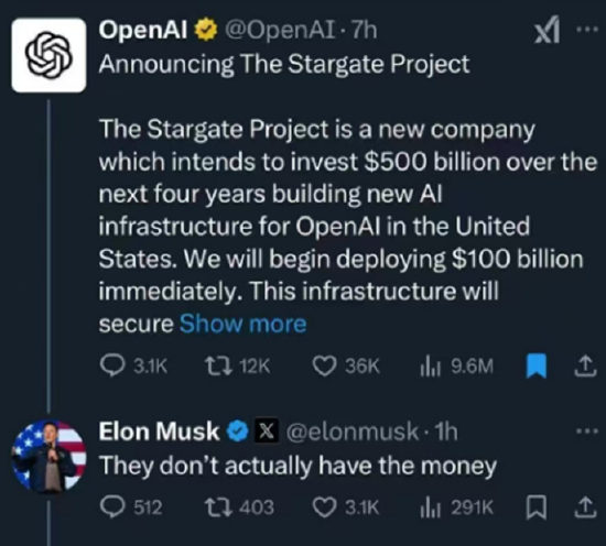 特朗普还宣布,OpenAI、软银和甲骨文已联手打造 “星际之门”(Stargate)项目,将共同投资5000亿美元,用于推动美国AI基础设施建设。