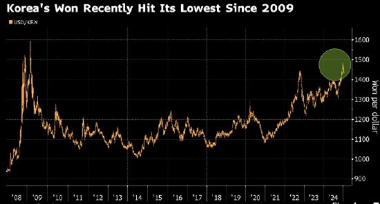 受到降息和政治动荡的拖累,韩元兑美元汇率上月底跌至2009年以来的最弱水平。