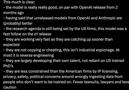 从目前来看,研究方向仍主要由美国公司主导,DeepSeek 模型属于对 o1 版本的‘快速跟进’,但 DeepSeek 的研发进度非常迅猛,比预期更快地迎头赶上,他们并没有抄袭或作弊,最多只是逆向工程。