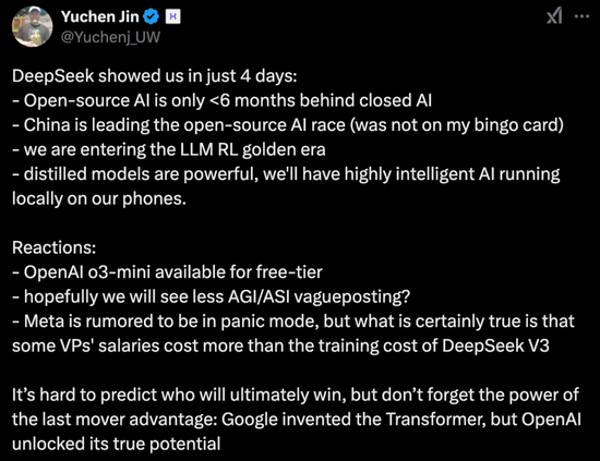 Hyperbolic 的 CTO、联合创始人 Yuchen Jin 发帖表示,在仅 4 天时间里,DeepSeek-R1 向我们证明了 4 个事实: