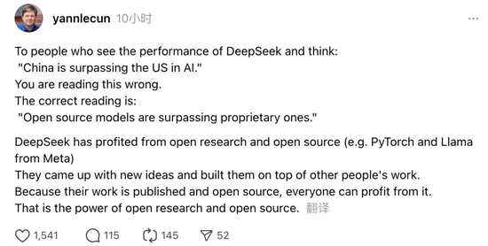 LeCun 表示,DeepSeek 之所以这次一鸣惊人,是因为他们从开放研究和开源(如 Meta 的 PyTorch 和 Llama)中获益。DeepSeek 提出了新想法,并在他人工作的基础上构建。因为他们的工作是公开发布和开源的,每个人都可以从中受益,这就是开放研究和开源的力量。