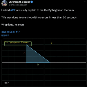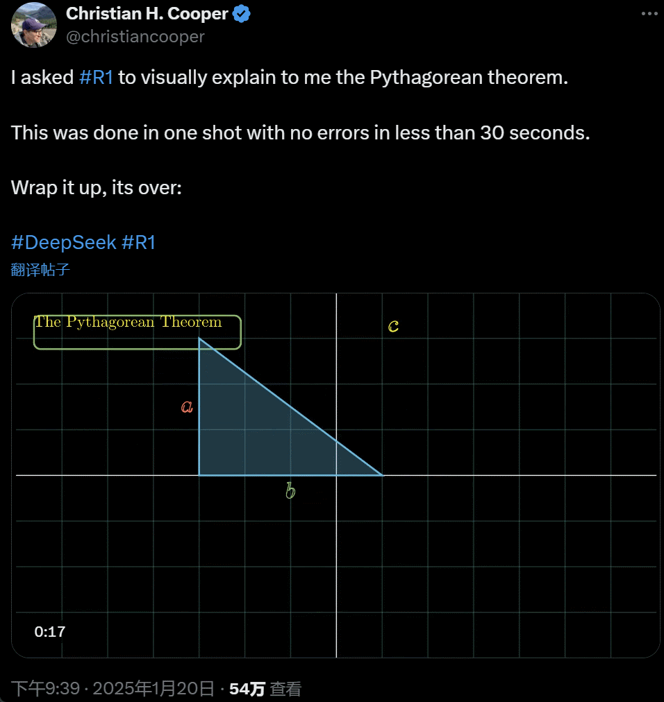 我让 R1 详细解释勾股定理。这一切都是 AI 在不到 30 秒时间里一次性完成的,没出任何错。简单来说,its over.