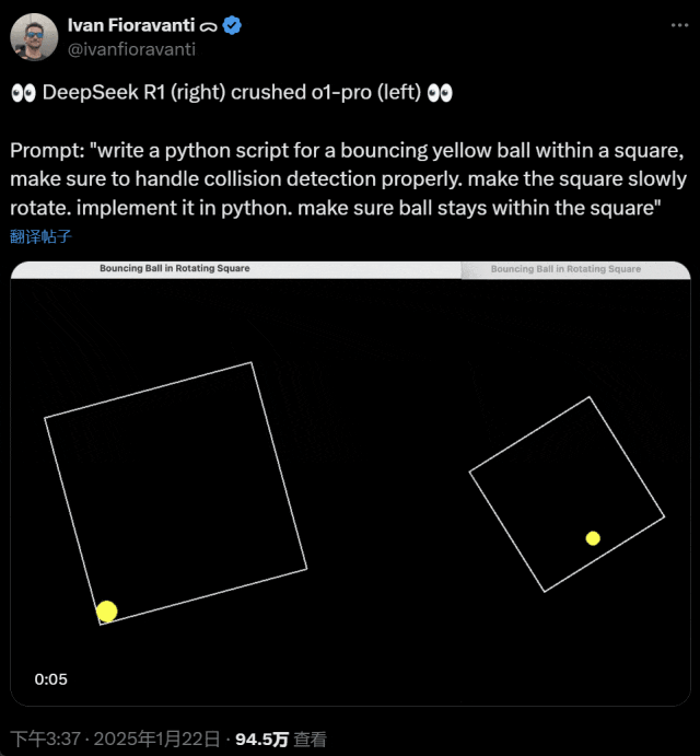 左边是 OpenAI o1,右边是 DeepSeek R1。如上所述,这里的 Prompt 是:‘write a python script for a bouncing yellow ball within a square, make sure to handle collision detection properly. make the square slowly rotate. implement it in python. make sure ball stays within the square.’