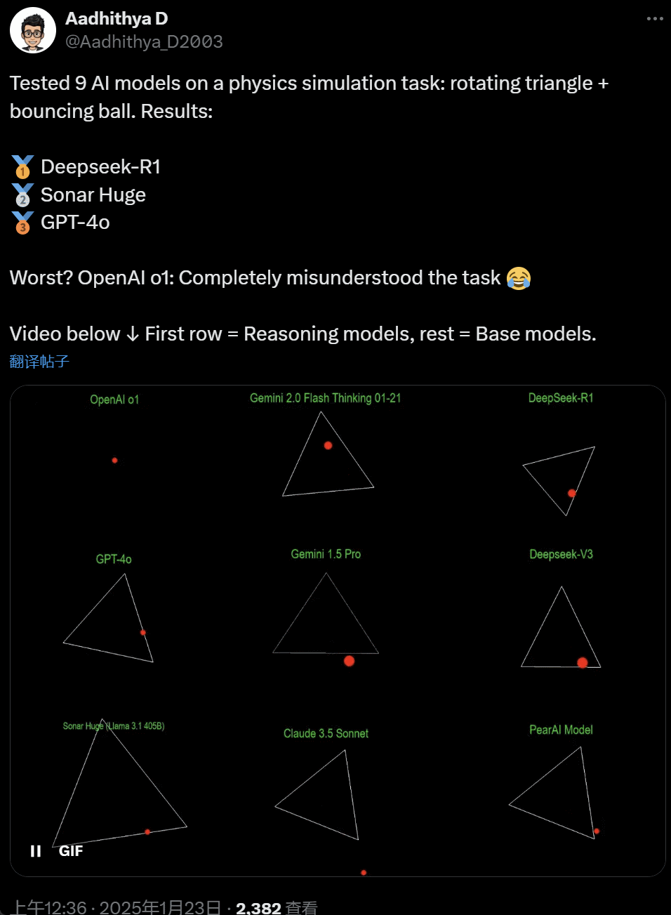 根据另一位网友在 X 上的说法,Anthropic 的 Claude 3.5 Sonnet 和谷歌的 Gemini 1.5 Pro 模型对物理原理判断错误,导致球偏离了形状。也有用户报告称,谷歌最新的 Gemini 2.0 Flash Thinking Experimental,以及相对更旧的 OpenAI GPT-4o 都一次性通过了评估。