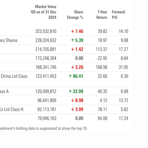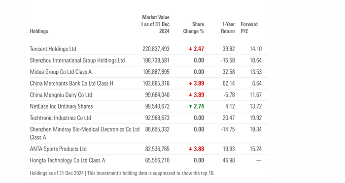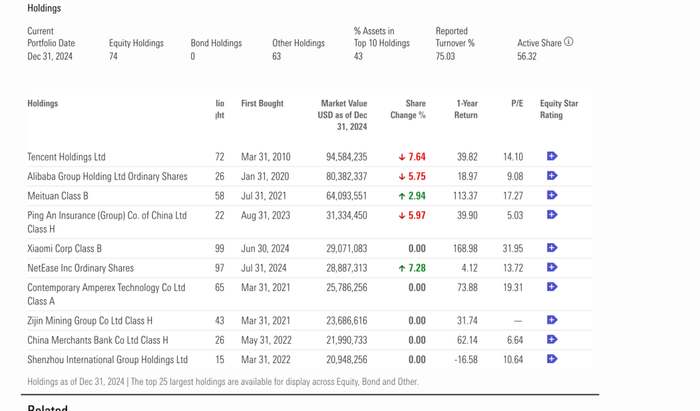 截至2024年底,基金前十大重仓股为腾讯控股、阿里巴巴、美团、中国平安、小米集团、网易、宁德时代、紫金矿业、招商银行、申洲国际。2024年12月,基金加仓网易7.28%,加仓美团2.94%;同期,基金减持网易7.64%,减持阿里巴巴5.75%,减持中国平安5.97%。