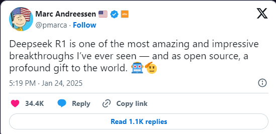 Andreessen Horowitz的联合创始人Marc Andreessen将DeepSeek R1描述为“AI的斯普特尼克时刻”(人们认识到自己受到威胁和挑战,必须加倍努力,迎头赶上的时刻),也是他所见过的最令人惊叹和印象深刻的突破之一。他还赞扬了其开源性质,称其为“献给世界的深刻礼物”。这番评论突显了该模型的重要性及其对行业的影响。