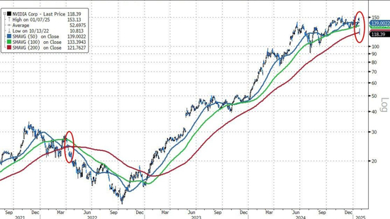 全球科技股惨遭抛售,因为投资者担心DeepSeek的出现会威胁到英伟达(NVDA)等当前AI领袖的主导地位。以科技股为主的纳指周一下跌3.1%。根据LSEG的数据,英伟达是最大的拖累因素,其股价下跌了近17%,跌破其20日、50日和200日均线,市值一夜蒸发近6000亿美元,规模创美股史上最大。