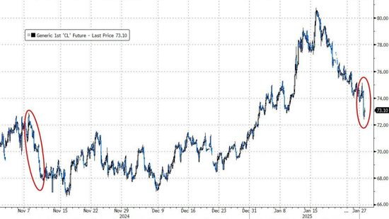 由于交易员定价“数据中心电力需求减少”,油价也暴跌,WTI原油盘中一度重挫3%,被推回大选前的高点以下。