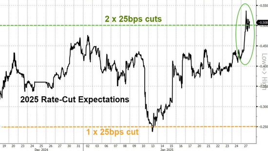 周一的避险基调将市场对美联储今年降息的定价推近美联储1月FOMC点阵图的预期,即50个基点。