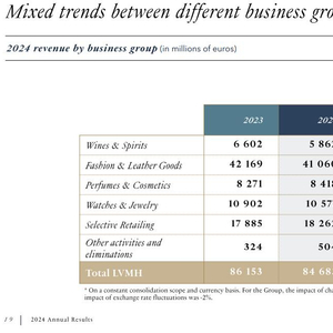Arnault说:“2024 年,在充满不确定性的环境中,LVMH 展现出强大的韧性。这种在动荡时期抵御风暴的能力——在我们集团的历史上已经多次得到证明——再次证明了我们战略的强大性和相关性。”他将去年的表现归功于LVMH“产品的创造力和极高的质量、我们对卓越的坚定承诺、我们团队的敏捷”,以及对不同地区市场的良好地域平衡。