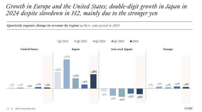 包括中国的在内的日本以外亚洲地区——LVMH的最大海外市场2024年有机营收负增长,除了下降6%一季度的以外,其他三个季度的降幅都超过10%。不过,LVMH指出,中国顾客赴日本和欧洲的消费增长强劲。换句话说,中国游客的海外消费还强劲支持了LVMH的业绩。