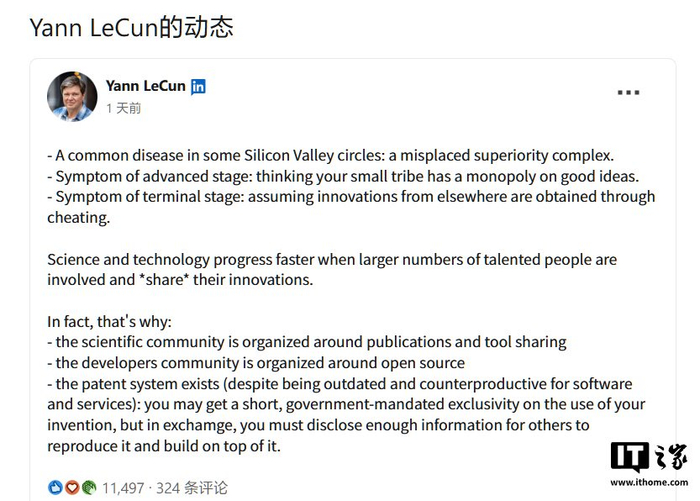 2 月 1 日消息,Meta 首席科学家杨立昆(Yann LeCun)昨日在其领英账号发文,直指硅谷“一些圈子”存在的问题。