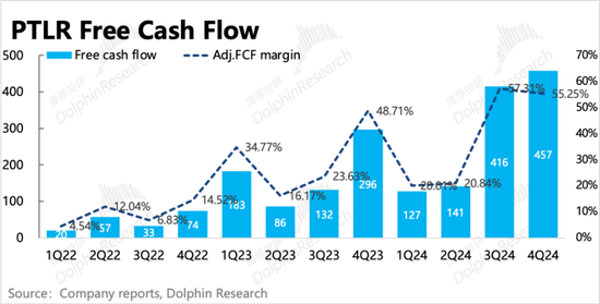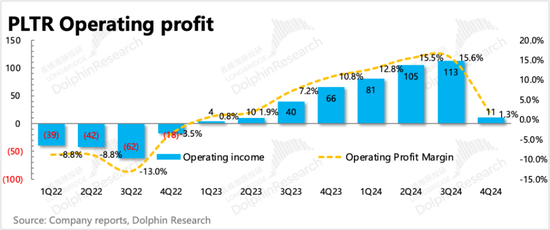 上季度海豚君预判控费周期已过,虽然Q4 Palantir确实进一步增加了开支(剔除SBC),但增速上看,从Q3的7%增长到Q4的15%,实际上也属于一个适度扩张。因此也没有给利润率带来太大的压力,继续靠着收入高增长提升。