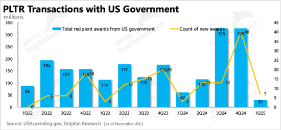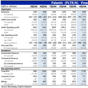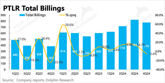 结合<1-4>,海豚君认为,当下客户端对Palantir的产品仍然非常感兴趣且合作意愿较高,但可能出于假期扰动或产品变化更迭较快等考虑,短期确定的有效订单增量略微走弱,但并不能说明Palantir的产品优势发生了改变。