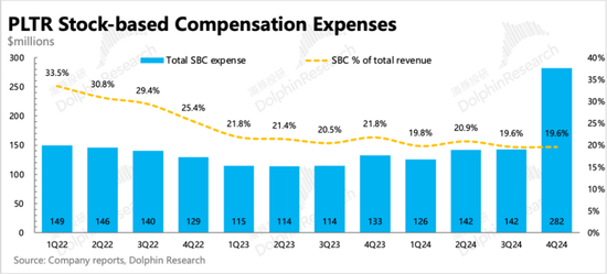 4. 费用扩张有度:上季度海豚君预判Palantir要开始提费用和投入了,四季度虽然提了一些,但整体可控,尤其是相较收入扩张幅度。GAAP下的费用增长主要源于员工股权激励SBC,但这里面有市值翻了一倍的因素在,实际从期权授予量的增长上来看,人力规模应该是只是适度扩张。