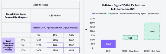 基于潜在客户生成的收费率,到2030年,人工智能购买代理可能为数字钱包平台带来400亿至2000亿美元的全球收入(分别为ARK的基本情况和乐观情况预测)。2030年,人工智能驱动的购买代理可能为美国数字钱包的企业价值(EV)每位用户增加50至200美元。