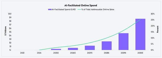 而在电子商务领域,人工智能代理的使用日益增加,这将简化产品发现、个性化推荐和购买流程。ARK的研究表明,到2030年,人工智能代理有望推动全球近9万亿美元的在线消费,接近全球可触达在线销售额的25%。