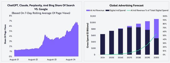 如果搜索转向个人人工智能代理,人工智能介导的广告收入可能会大幅增长。预计到2030年,人工智能广告收入可能占1.1万亿美元数字广告市场的54%以上。