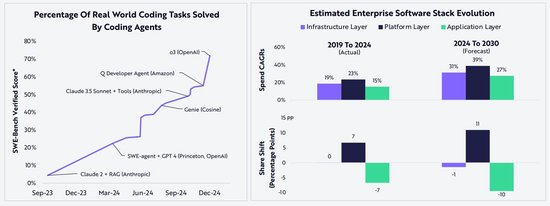 随着软件开发成本的下降,软件生产将加速,影响企业 “自行开发还是购买” 的决策,取代那些适应缓慢的传统软件企业。随着定制软件的普及,软件堆栈各层的增长都将加速,尽管市场份额会向平台层转移。