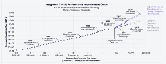 自2018年进入人工智能时代以来,AI计算性能已实现40次翻倍,2023年更是突破了48次。到本世纪末,得益于人工智能的加速发展,预计2030年将完成64次翻倍,达到 “棋盘的尽头”,这意味着计算能力将达到一个全新的高度。