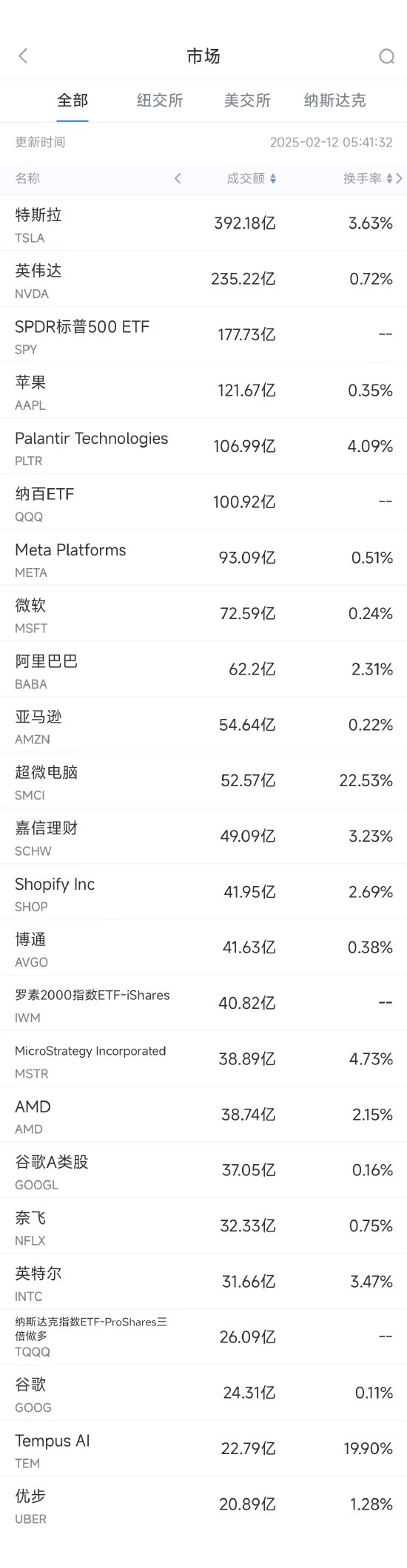 周二美股成交额第1名特斯拉收跌6.34%,创12月18日以来的最大单日跌幅,成交亿392.18美元。周二(2025年2月11日)特斯拉上海储能超级工厂在上海自贸区临港新片区正式投产。这座工厂生产的商用储能电池将被运往全球市场,助力世界范围的“绿色未来”。