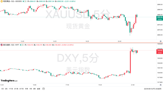 数据公布后,现货黄金短线一度下挫超10美元,随后强势反弹又重回2880美元关口上方;美元指数短线拉升50点后基本维持强势;非美货币普跌,欧元兑美元短线下挫40点;英镑兑美元短线下挫近70点;美元兑日元短线上扬近120点;美债遭遇大幅抛售。