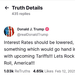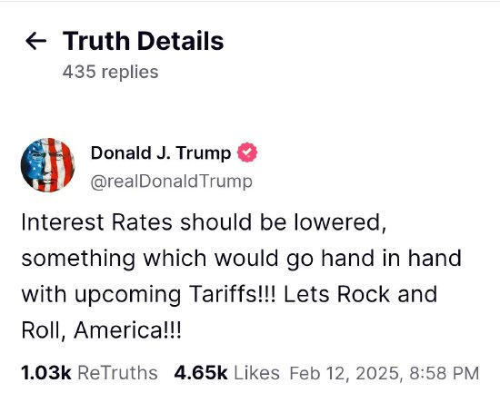 特朗普周三在社交媒体上发帖称,“应该下调利率,与即将实施的关税齐头并进”。