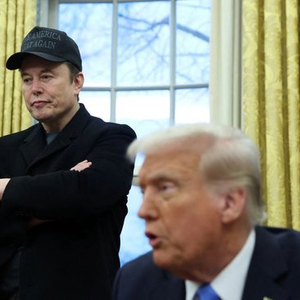 埃隆・马斯克在白宫椭圆形办公室聆听唐纳德・特朗普总统讲话。
