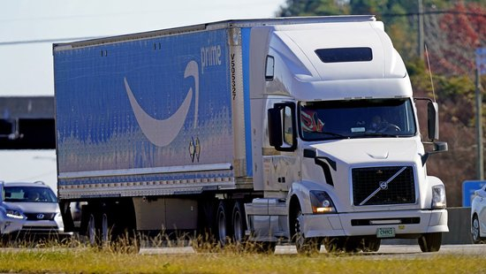 一辆亚马逊 Prime 快递卡车行驶在北卡罗来纳州梅班附近的 40 号州际公路上。