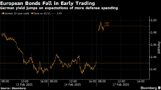 德国10年期国债收益率在早盘交易中上涨6个基点,至略低于2.50%,欧元下跌,防卫公司德国莱茵金属创下纪录新高。美国国债市场因公共假日休市,不过期货暗示10年期国债收益率升至4.50%以上。