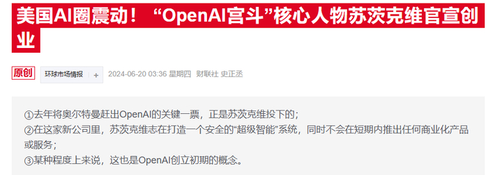 AI安全一直是苏茨克维最关心的问题。2023年11月,他曾与OpenAI的董事会成员一道罢免了首席执行官萨姆·奥尔特曼(Sam Altman)。