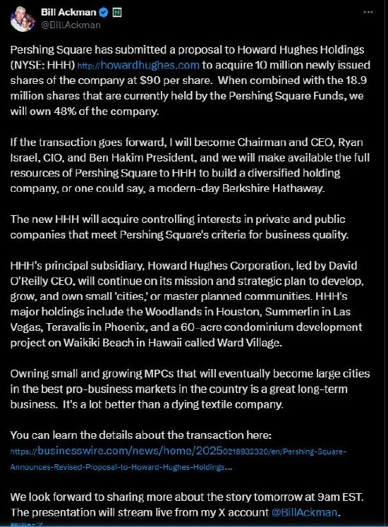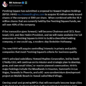 阿克曼在社交媒体网站X上发帖称:“我们将把潘兴广场的全部资源提供给HHH,以建立一家多元化的控股公司,或者可以说,一个现代版的伯克希尔哈撒韦公司。新的HHH将收购符合潘兴广场商业质量标准的私营和上市公司的控股权。”