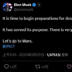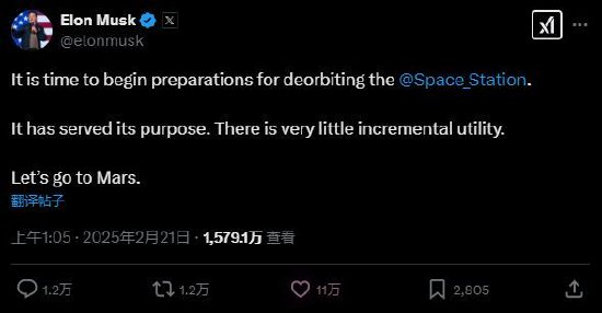 “是时候开始为空间站脱离轨道做准备了,”马斯克在他拥有的社交媒体网站X上发帖说,“它已经达到了目的。增量效用非常少。让我们去火星吧。”